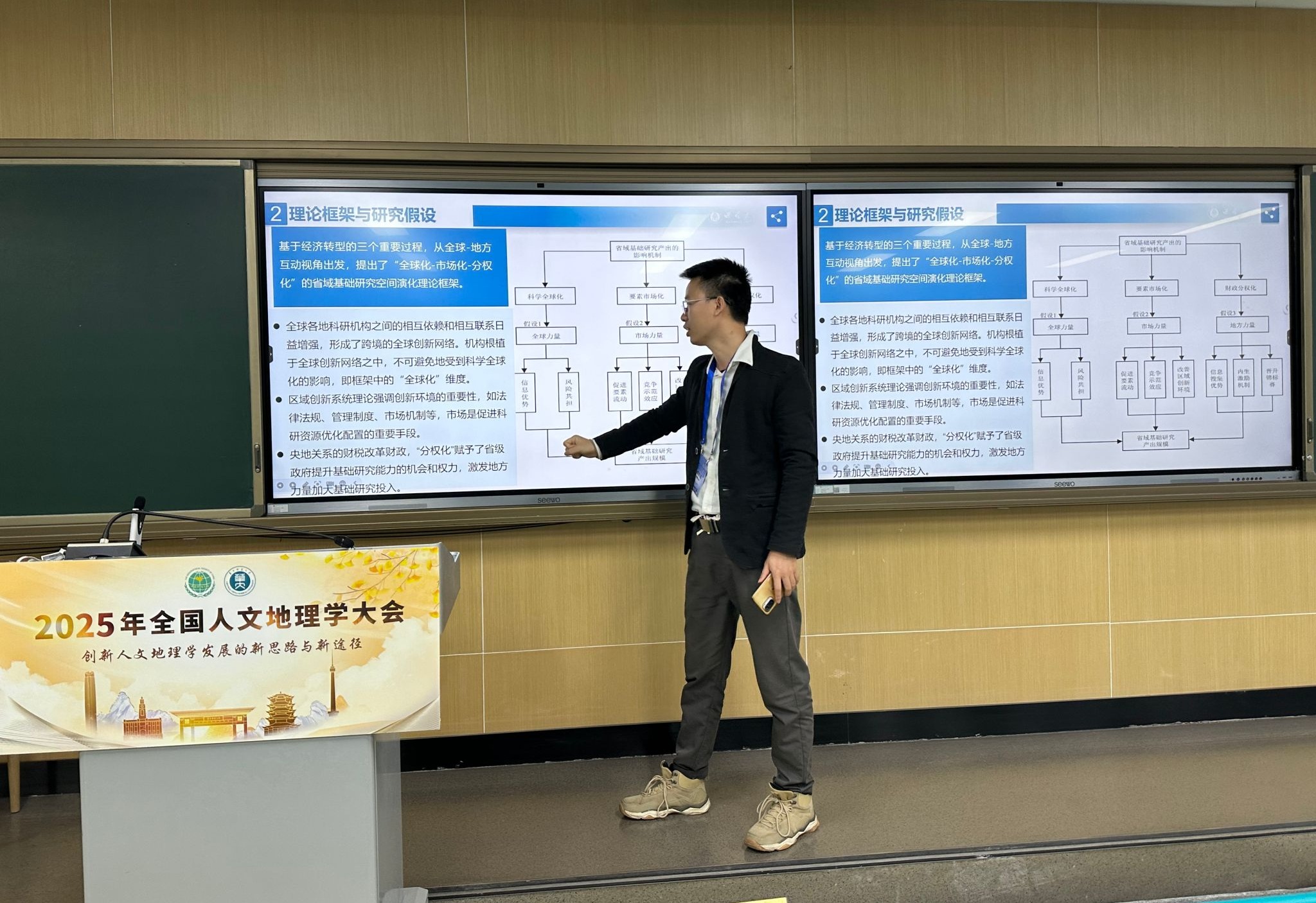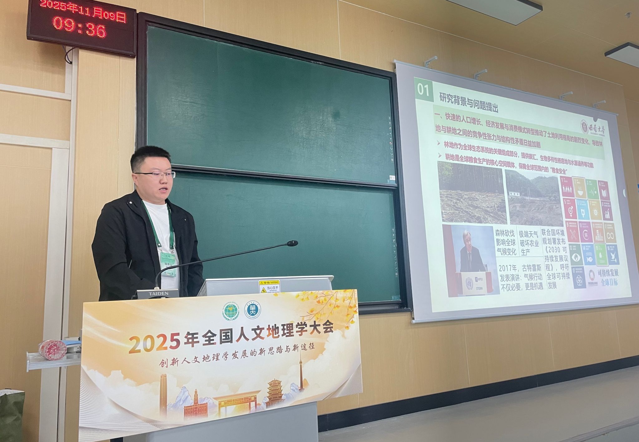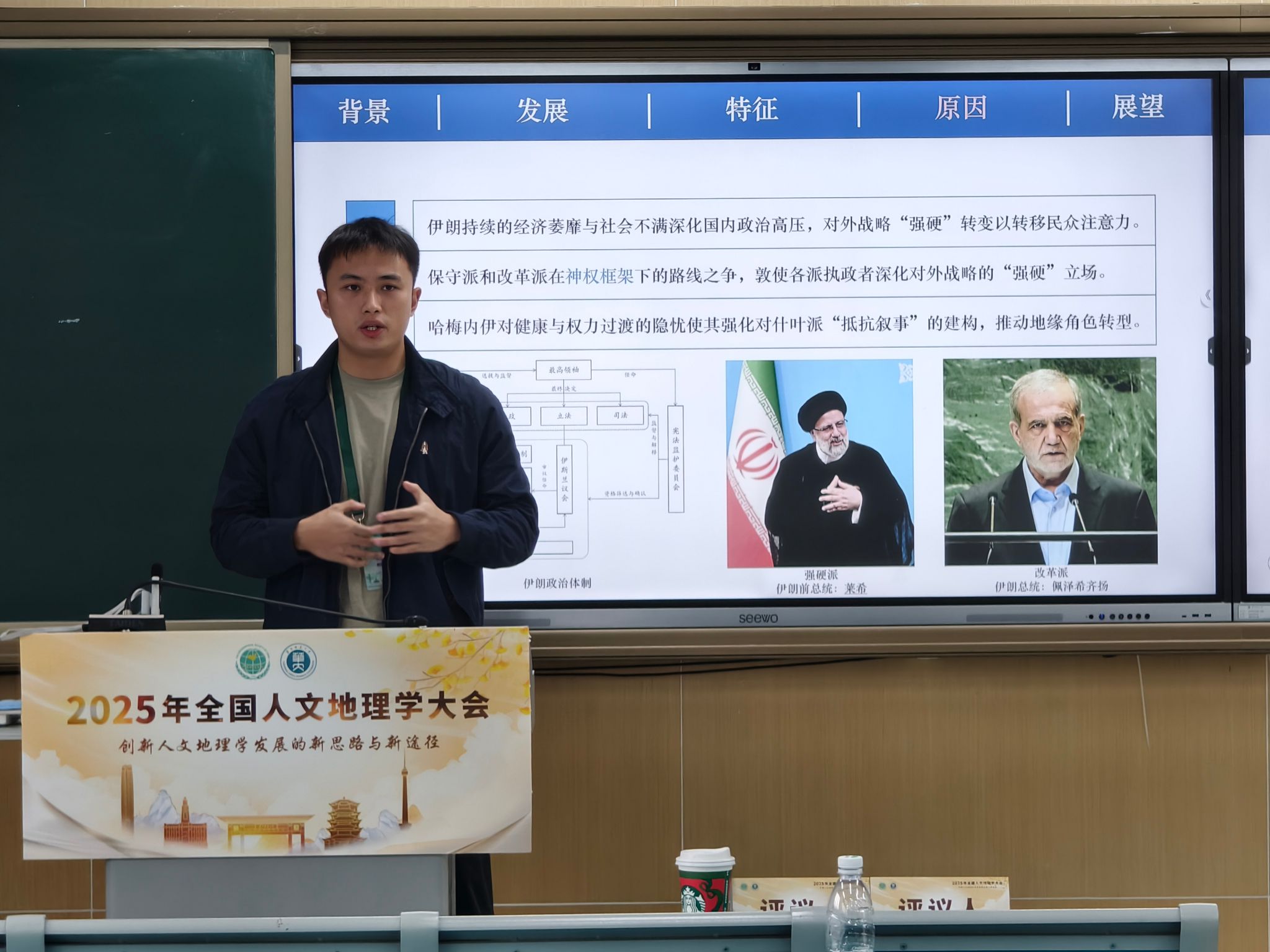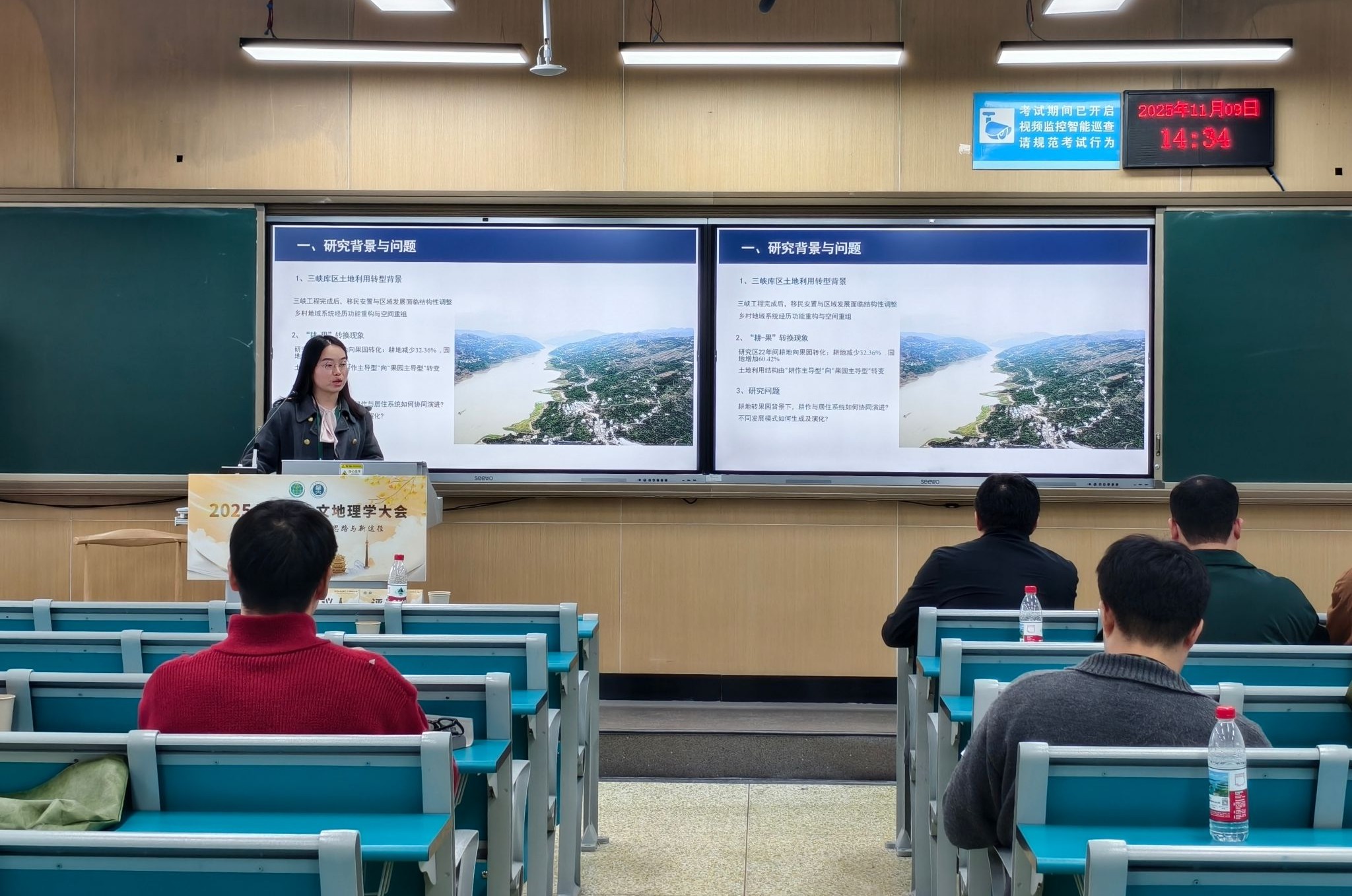 王成教授担任“青藏高原人地系统与乡村可持续发展”分会场评议人,通过科学严谨的点评方式,为年轻学者和研究生提出建议并分享研究经验;宗会明教授担任“新技术空间与地方重构”分会场评议人,并以“重庆市城乡快递物流网络空间结构及其影响因素分析”为题探讨电商发展背景下快递物流设施在城市和乡村的布局网络特征及组织模式;陈俊华副教授在“政治地理理论前沿与跨学科应用”分会场以“伊朗对外战略中硬姿态与软操作的双重性分析”为题探讨了伊朗在2025年6月份伊以冲突中“硬姿态”和“软操作”的表现、动因、成效以及对中东地缘政治格局的影响;桂钦昌副教授担任“科技地理与区域创新”分会场主持人,并以“经济转型背景下中国省域基础研究产出的时空演变及影响因素”为题探讨了2000-2024年中国省域基础研究产出的时序演变与空间格局动态,从全球-地方互动视角构建了“全球化-市场化-分权化”三维解释框架。