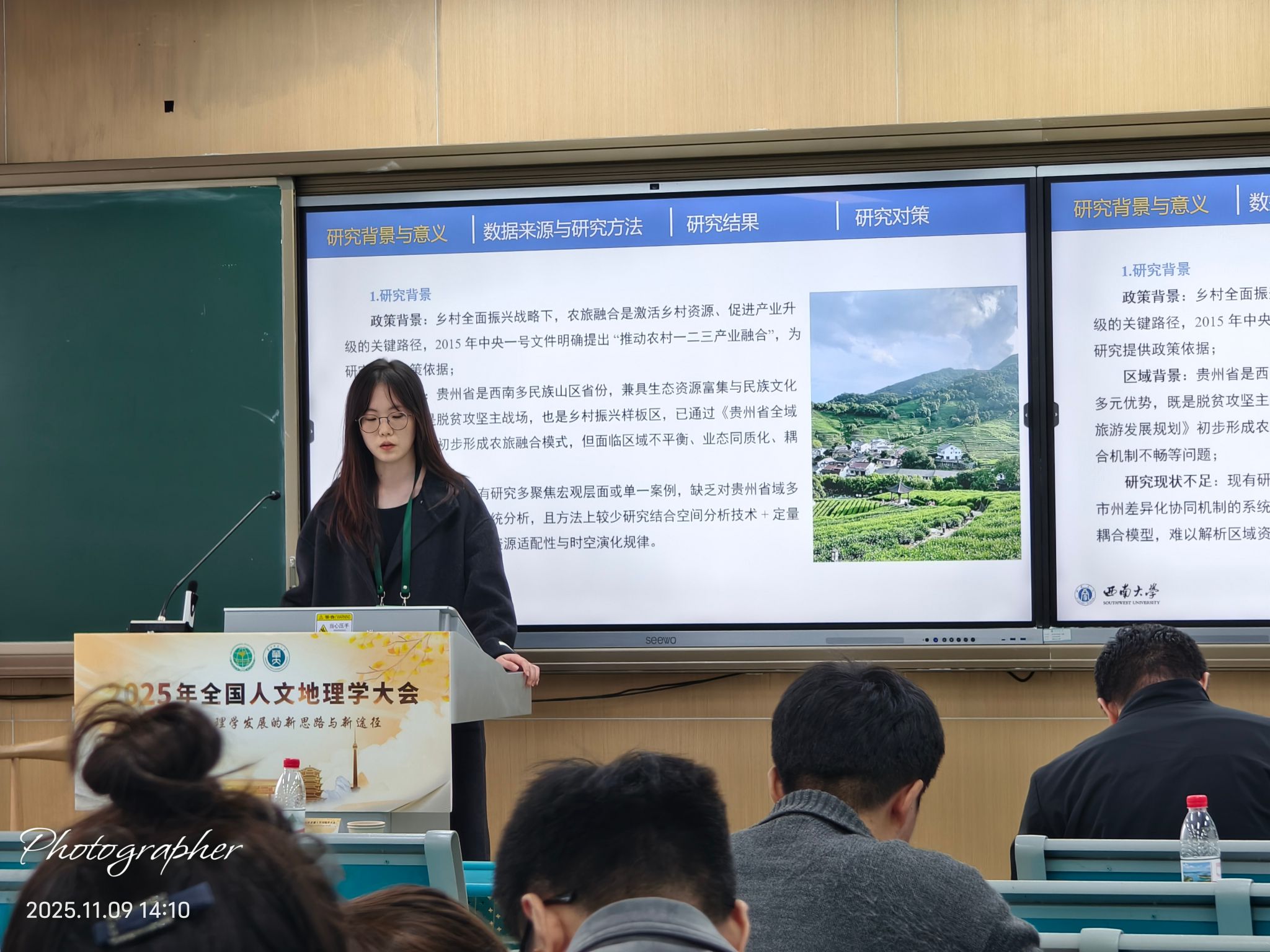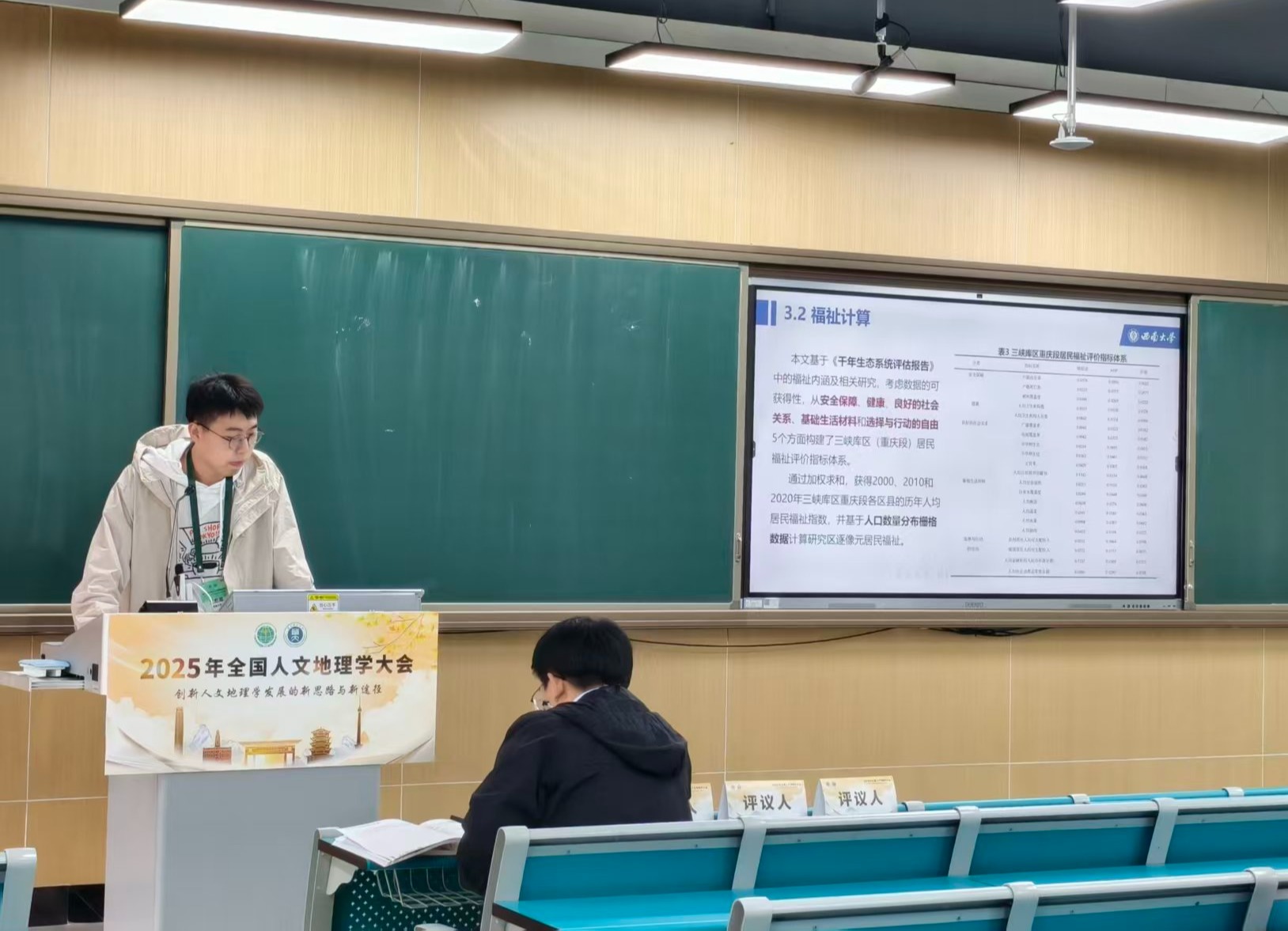 硕士生王浩骅在“城乡融合发展与国土空间治理”分会场以“三峡库区景观生态风险的时空演变特征、驱动机制与未来情景模拟”为题进行汇报;硕士生王愈滋在“人地耦合与高质量发展”分会场汇报了“三峡库区(重庆段)生态系统服务对居民福祉的贡献”最新研究成果;硕士生唐业清在“人地耦合与高质量发展”分会场以“后三峡时代三峡库区生态系统服务时空演化特征及其权衡与协同作用”为题进行汇报;硕士生余梦莉在“新时期乡村建设与城乡融合”分会场以“乡村全面振兴背景下贵州农旅融合高质量发展研究”进行成果展示;硕士生田园在“全球地缘政治格局演变与区域国别空间重构”分会场以“新一轮巴以冲突下的伊朗地缘战略:从幕后到台前的角色嬗变”为题进行分享;硕士生张亚男在“新时期乡村建设与城乡融合”分会场以“农村集体经营性建设用地入市能否缩小城乡收入差距?——基于全国1380个县域面板数据的实证”为题进行汇报。